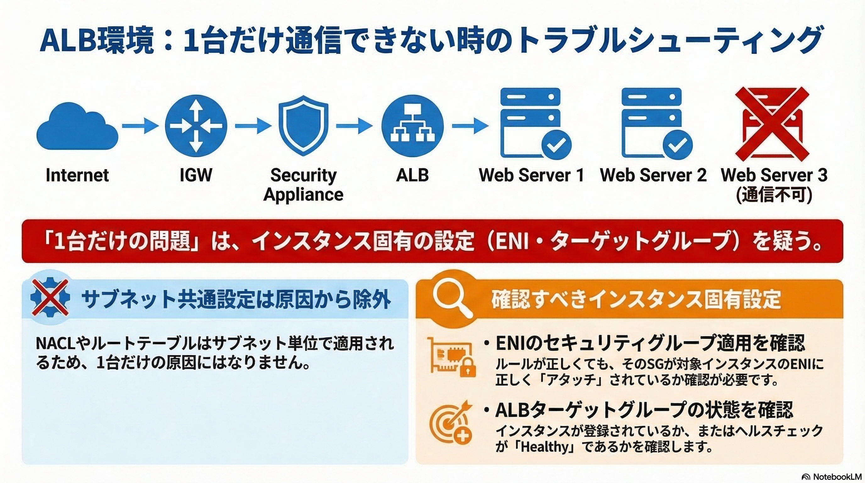 Application Load Balancer(ALB)で負荷分散されたWeb Server群のうち、1台だけがインターネットからの接続を受信できないというトラブルは、実務でも試験でも頻出のシナリオです。