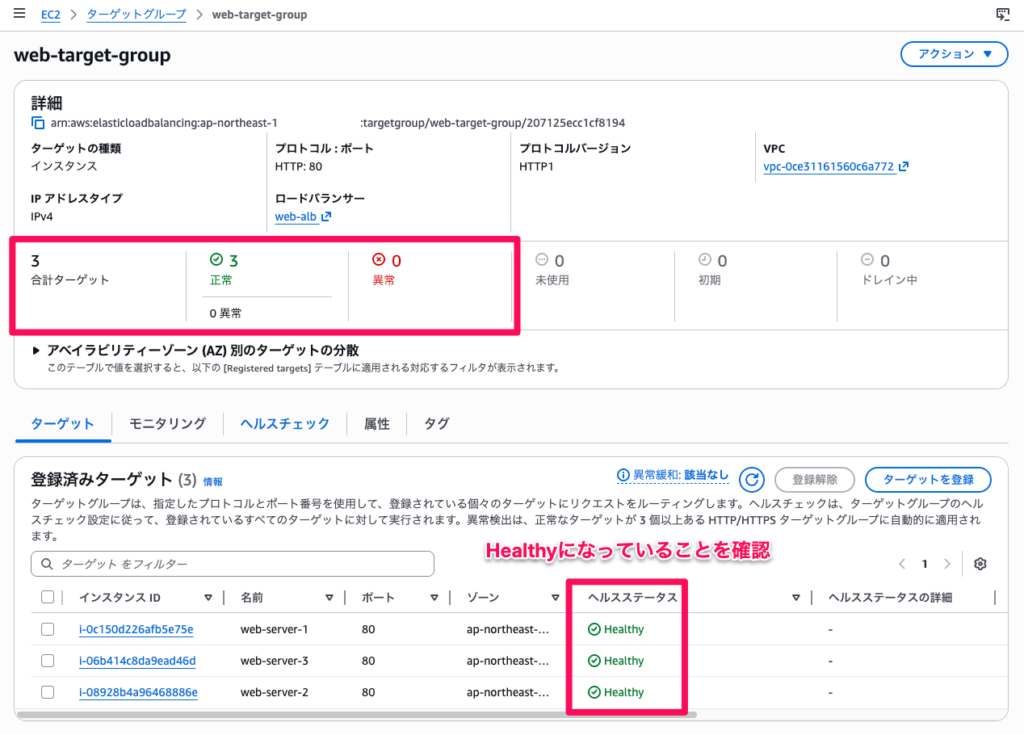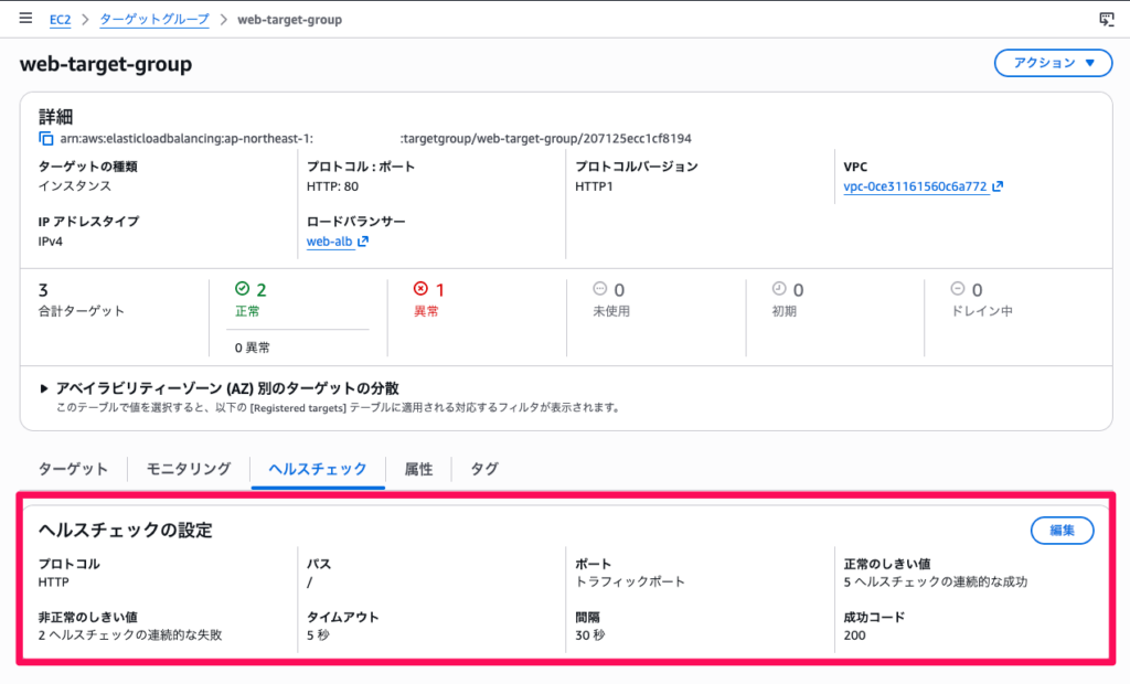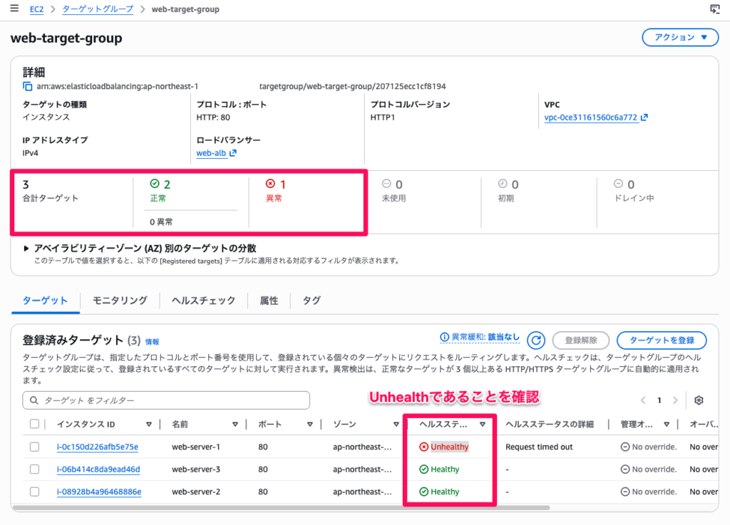 web-target-groupを選択し、「ターゲット」タブを開きます。- 問題のWeb Serverのヘルスステータスが