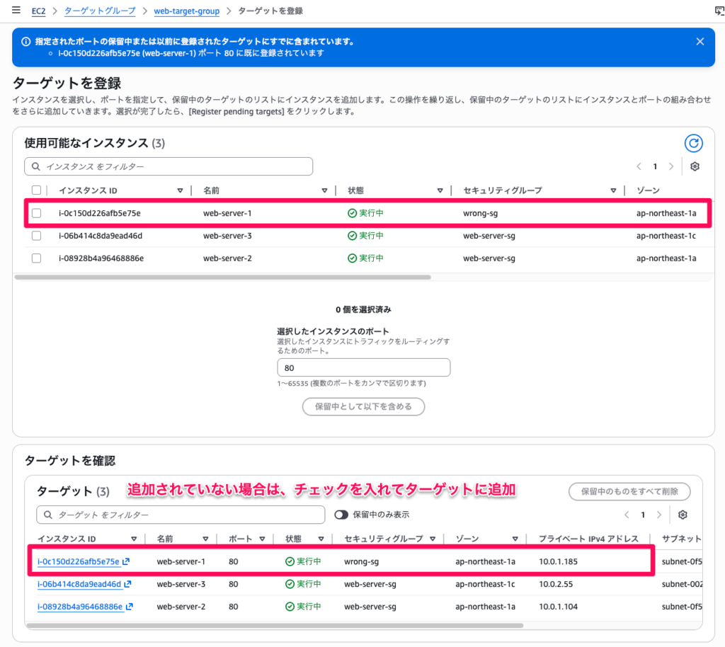 web-server-1など)が一覧に表示されているか - 表示されていない場合は、ターゲットグループに未登録であることが原因です