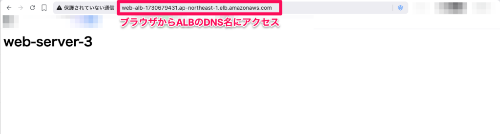 web-alb-xxxxxxxxxx.ap-northeast-1.elb.amazonaws.com)にブラウザでアクセスし、正常にページが表示されることを確認します。 - 複数回リロードして、問題のWeb Serverにもトラフィックが分散されていることを確認します。アクセスログやアプリケーション側でどのサーバーが応答しているかを確認できるようにしておくと、分散状況がわかりやすくなります。