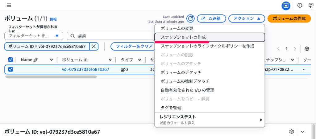 • 画面上部の「アクション」をクリックし、「スナップショットからボリュームを作成」を選択します。