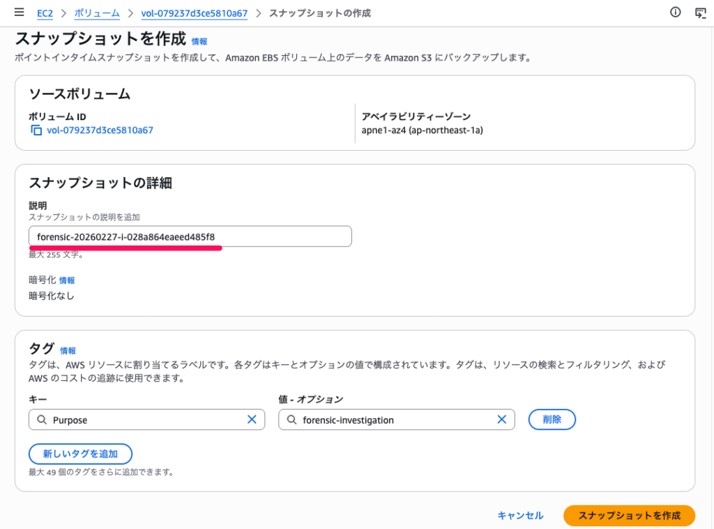 • 説明: forensic-YYYYMMDD-i-xxxxxxxxxxxxxxxxx(日付とインスタンスIDを含めて識別しやすくします)