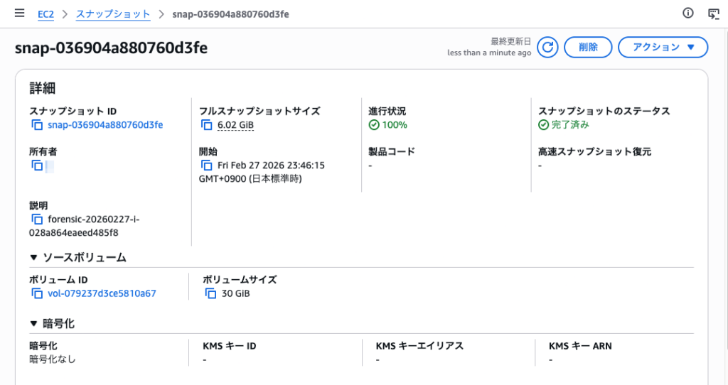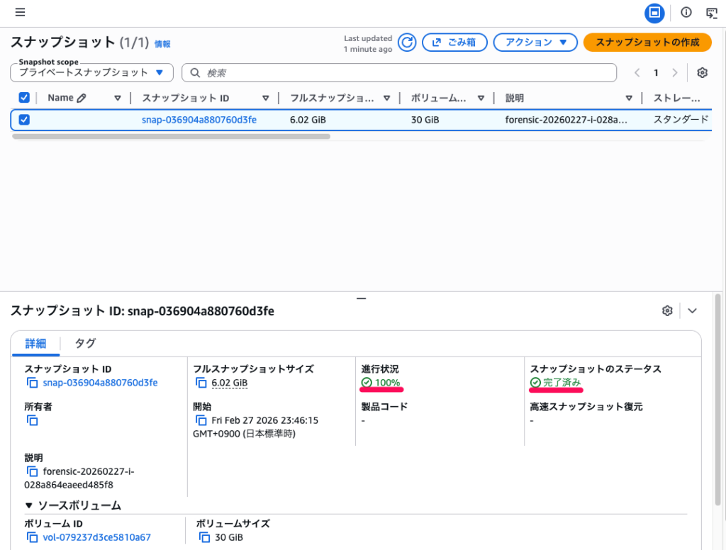 EBSボリュームスナップショットから作成フォレンジクスアカウント分析用ボリューム