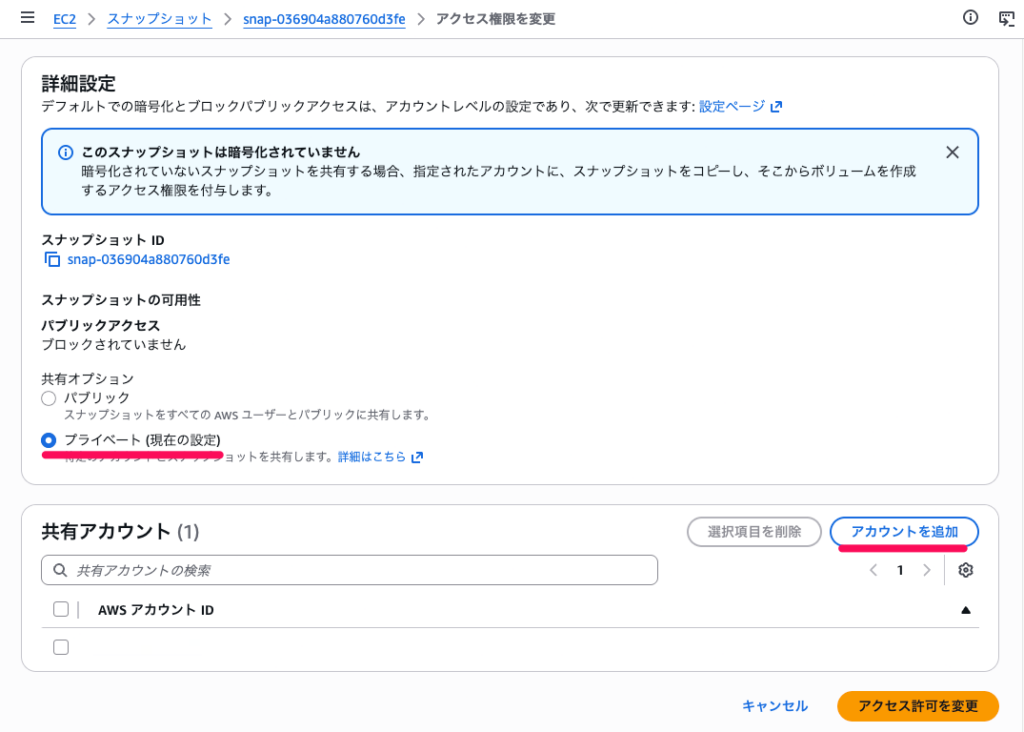 • スナップショットの共有: 「プライベート」が選択されていることを確認します