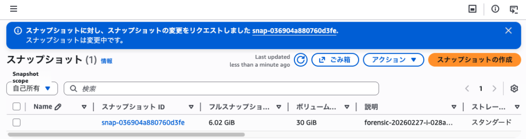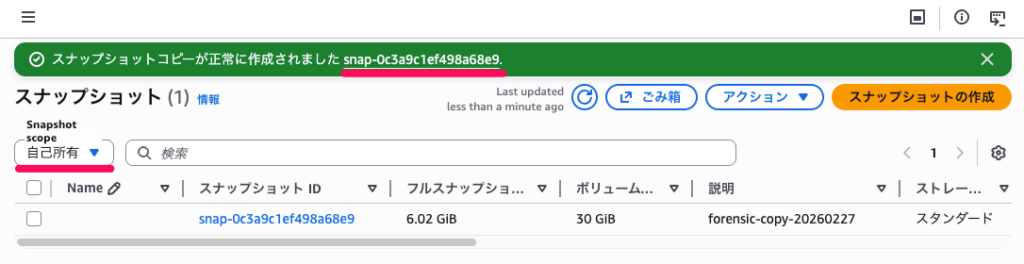 • スナップショット一覧画面に戻り、フィルターを「自己所有のスナップショット」に切り替えます。コピーされたスナップショットが作成されていることを確認します。