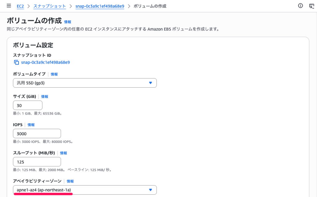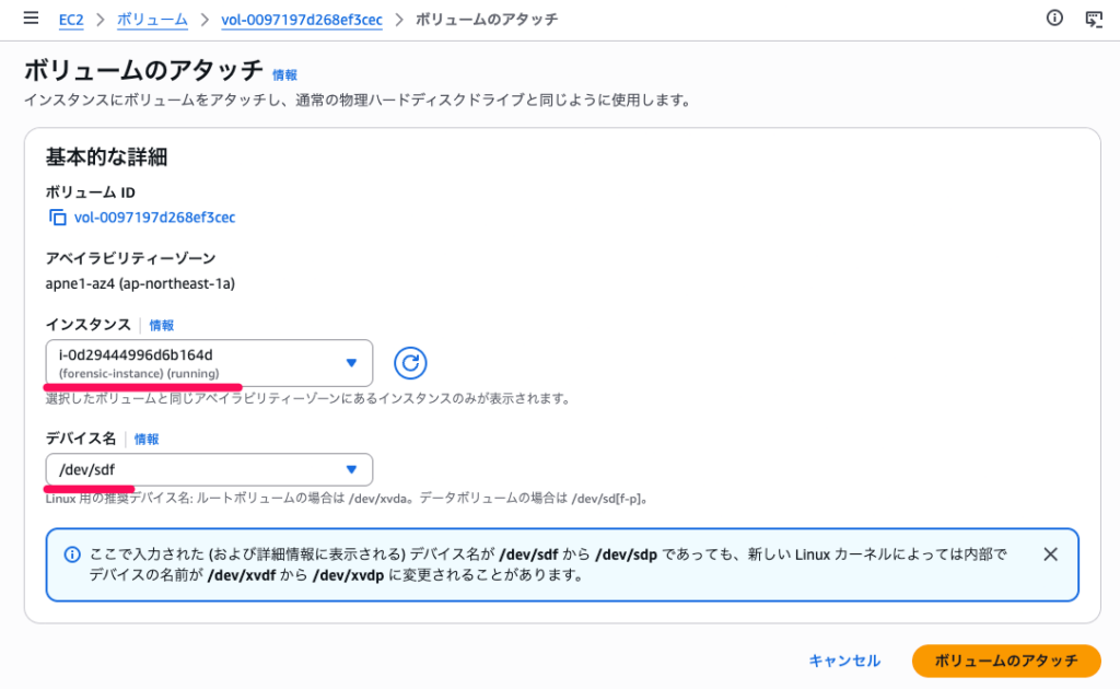 • アベイラビリティゾーン: フォレンジクス用EC2インスタンス(forensic-instance)と同じアベイラビリティゾーンを選択します(例: ap-northeast-1a
