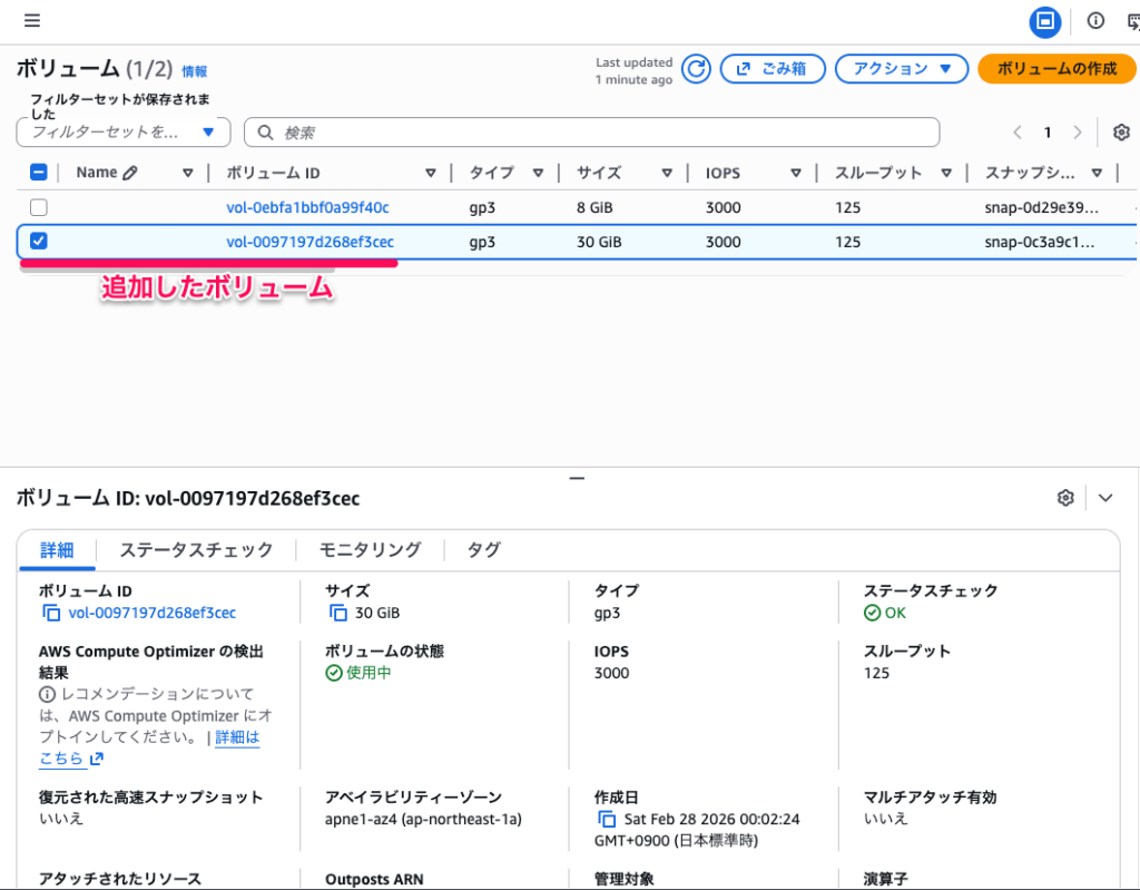 • ボリューム詳細ページに遷移します。対象ボリュームのチェックボックスを選択します。