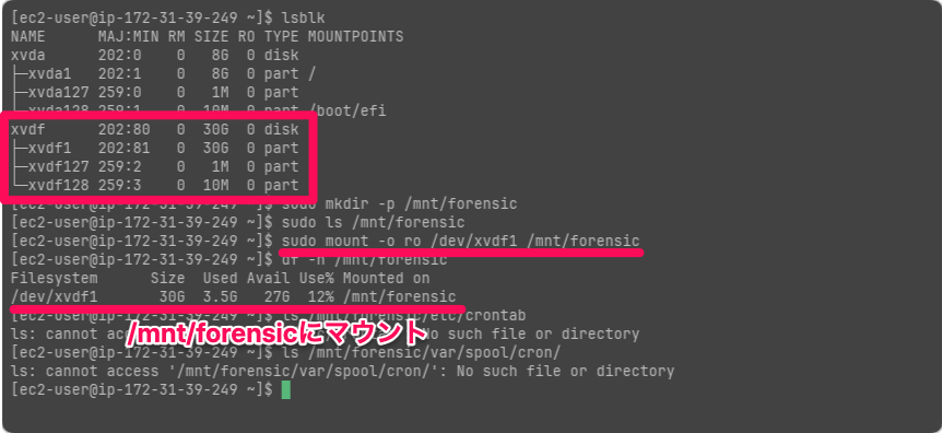 フォレンジクス用EC2インスタンスにSSH(またはSSM Session Manager)でログインし、アタッチされたボリュームを読み取り専用でマウントします。