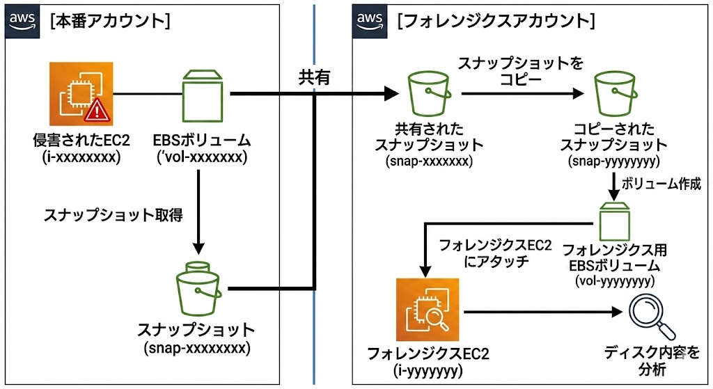 侵害されたEC2インスタンスのディスク内容を調査する際、侵害済みのインスタンスに直接ログインすると、ファイルシステムへの書き込みが発生し証拠が汚染されるリスクがあります。この問題を避けるために、AWSではEBSスナップショットを取得して別環境にアタッチするというアプローチが推奨されています。