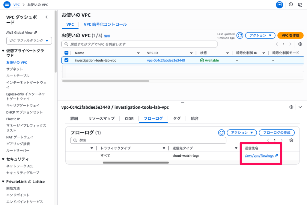 - フローログの送信先(CloudWatch Logsグループ名)を確認します。例:
