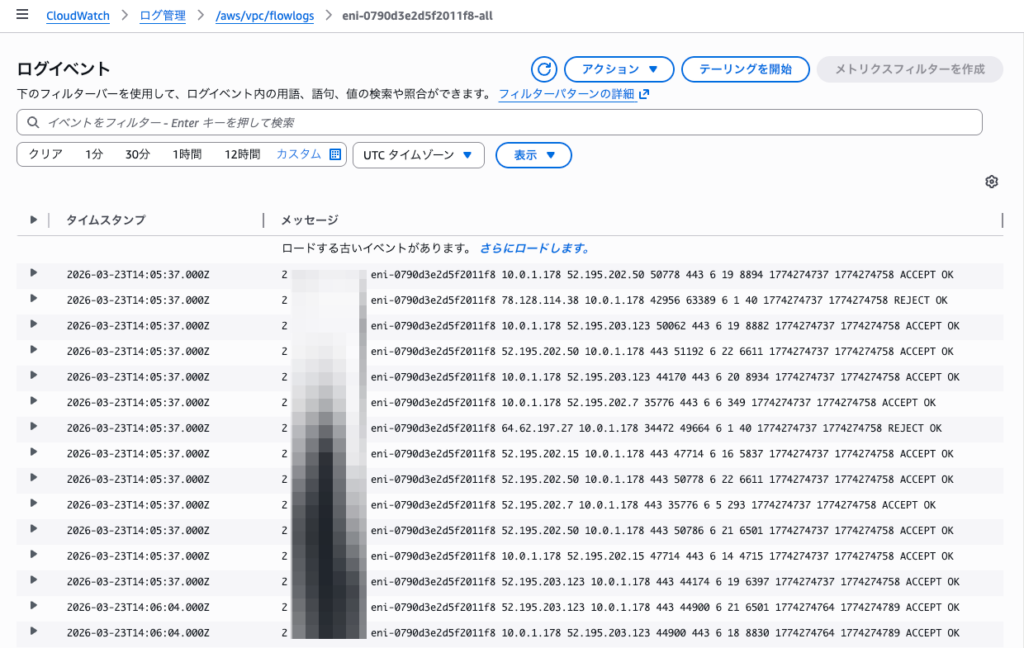 screenshot: CloudWatch Logsのログストリーム画面(対象ENIのフローログレコードが一覧表示されている状態)