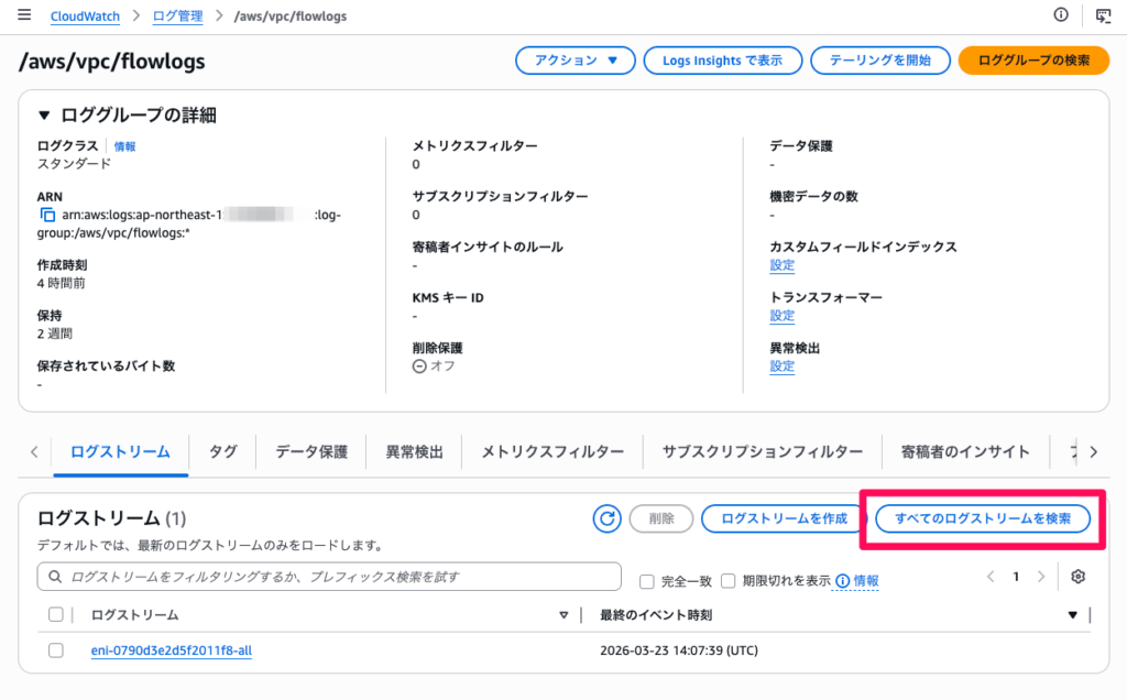 | CloudWatch Logsグループ | VPC Flow Logs配信先 | フローログの検索 |
