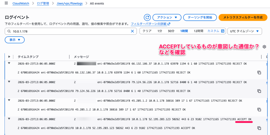 この例では、外部IPアドレス 203.0.113.50 からインスタンスのプライベートIP 10.0.1.100 のポート22(SSH)に対して、プロトコル番号6(TCP)の通信が許可(ACCEPT)されたことを示しています。