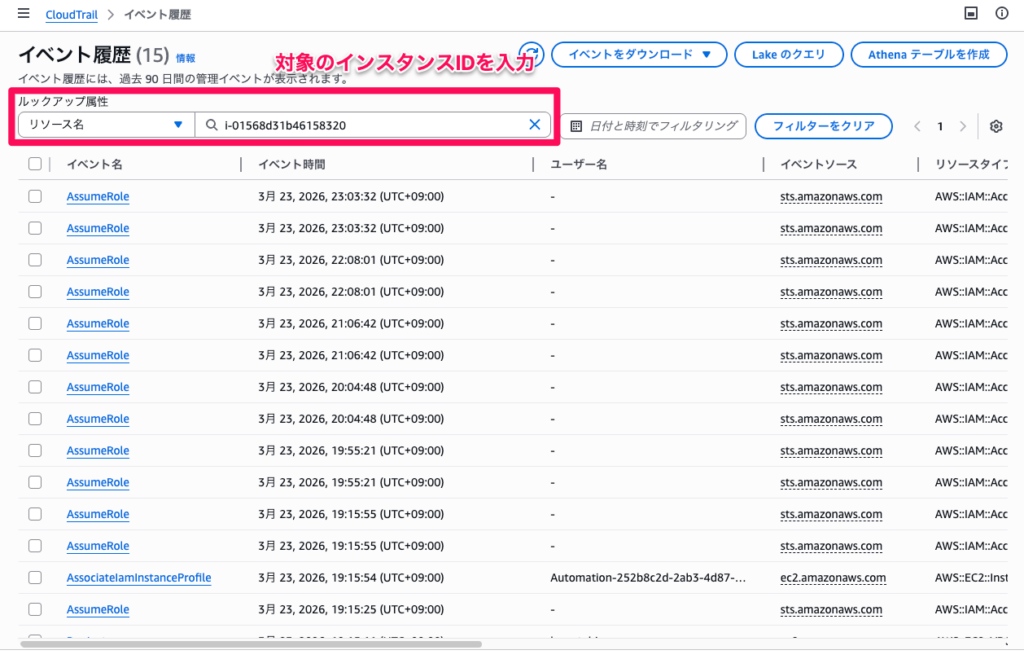 screenshot: CloudTrailのイベント履歴画面(リソース名でインスタンスIDを検索し、関連イベント一覧が表示されている状態)