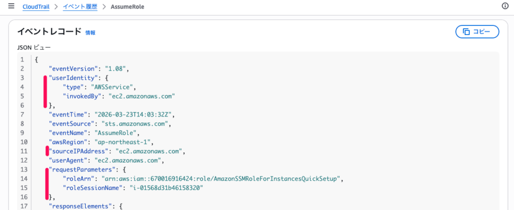 - 操作を実行したIAMユーザーやロール、送信元IPアドレス