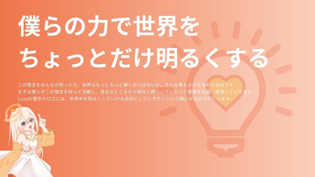 2015年創業の株式会社Luxyは「世界をちょっと明るくする」を企業理念に掲げ、一人ひとりが身近なところを明るく照らしていく思いでSES事業を運営している会社です。