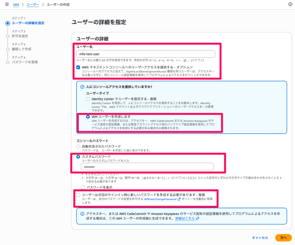 mfa-test-userと入力します。 - 「AWS マネジメントコンソールへのユーザーアクセスを提供する」にチェックを入れます。