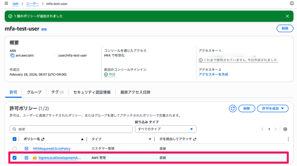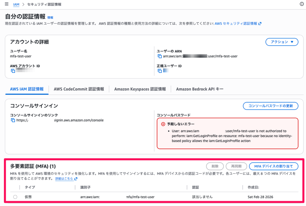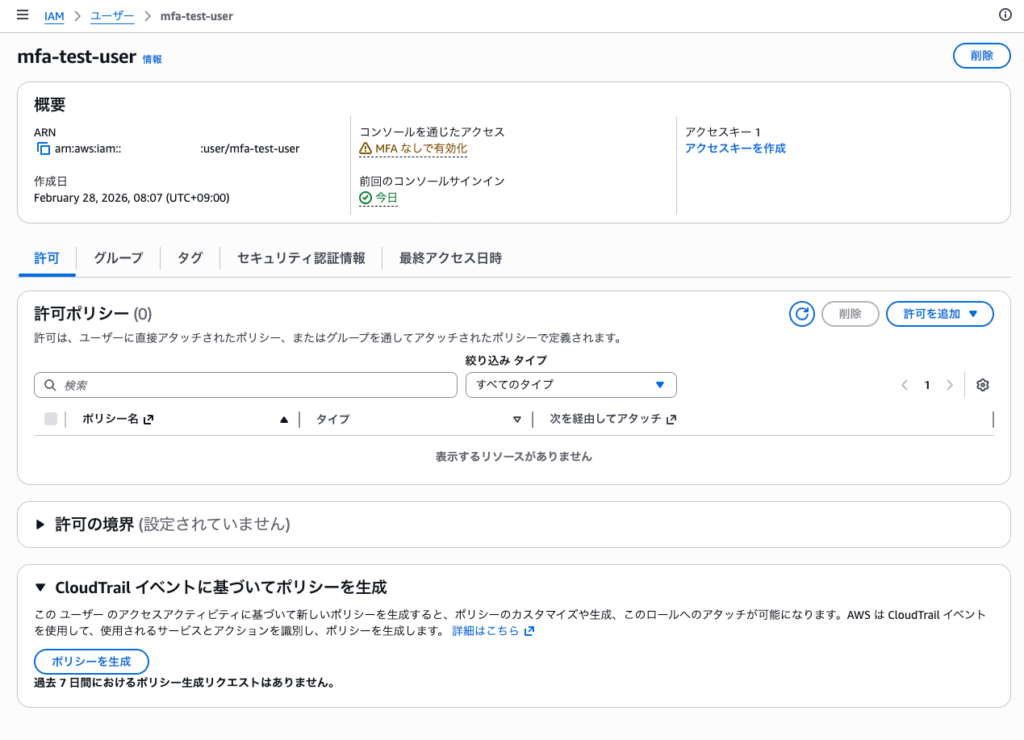 | IAMユーザー | mfa-test-user | 検証用ユーザー |