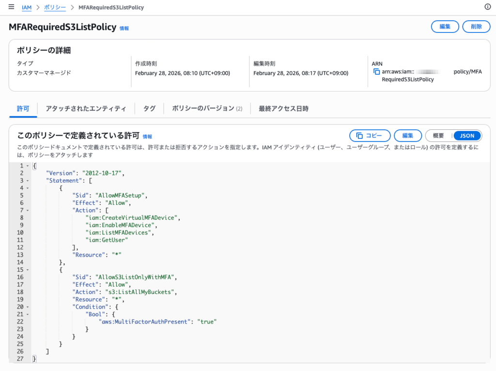 | IAMポリシー | MFARequiredS3ListPolicy | MFA認証済みユーザーのみにS3一覧表示を許可 |