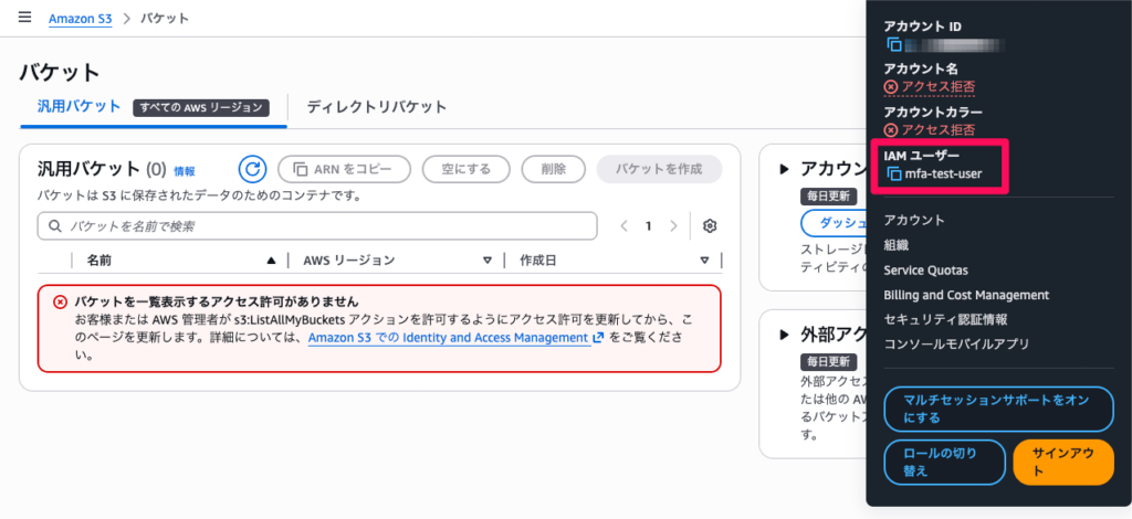 S3と入力し、表示された「S3」を選択します。 - バケット一覧画面で「バケットを表示するアクセス許可がありません。」というエラーメッセージが表示されることを確認します。