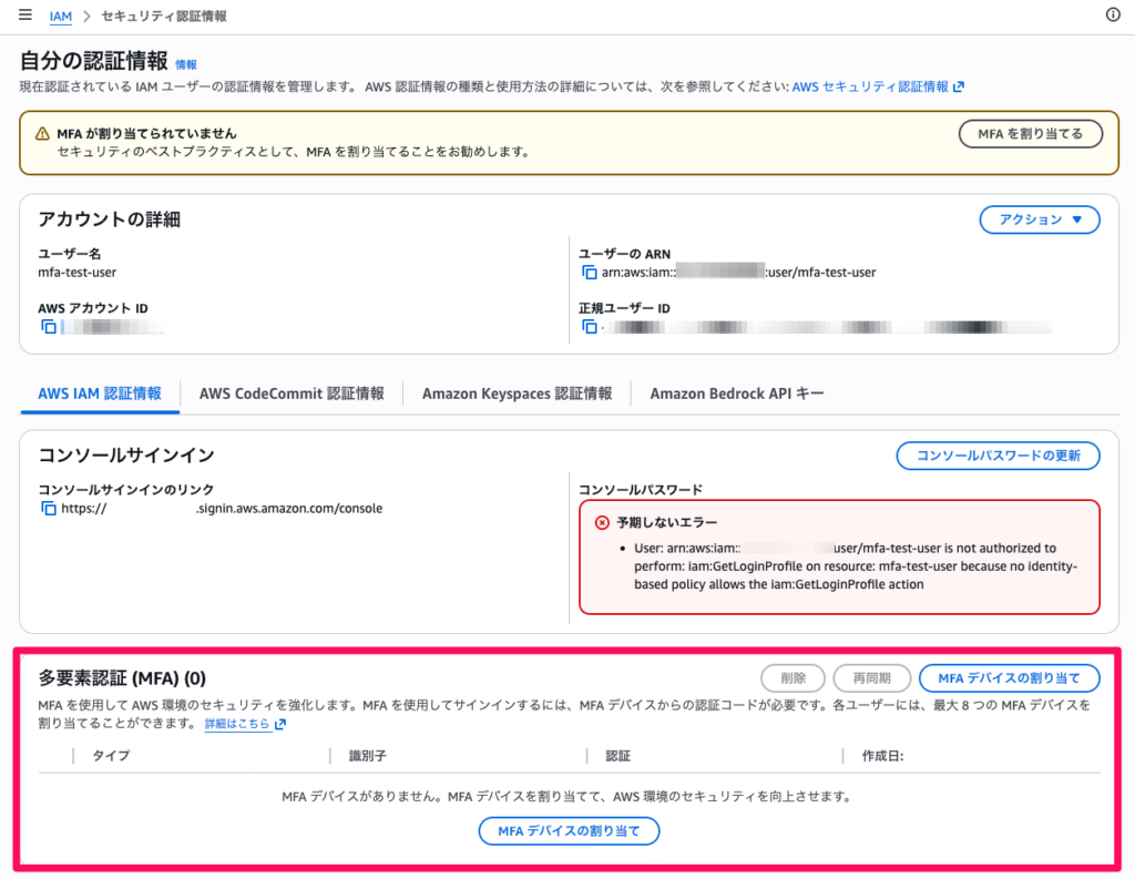 - 「多要素認証(MFA)」セクションの「MFA デバイスの割り当て」をクリックします。