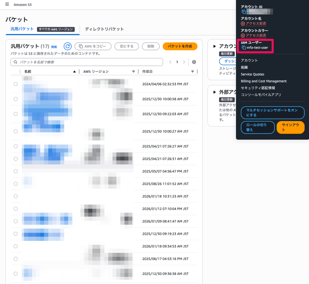 ここでは、検証用のIAMユーザーを作成し、MFA認証済みのユーザーのみにS3バケットの一覧表示を許可するIAMポリシーをアタッチして、MFA認証の有無による挙動の違いをコンソールとCLIの両方で確認します。