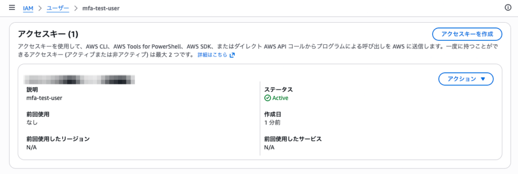 mfa-test-userのユーザー詳細画面を開きます。 - 「セキュリティ認証情報」タブの「アクセスキー」セクションで「アクセスキーを作成」をクリックします。