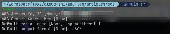CLIでの挙動も確認します。作業用ユーザでサインインしてmfa-test-user のアクセスキーを作成し、長期アクセスキーで直接リクエストした場合の挙動を確認します。