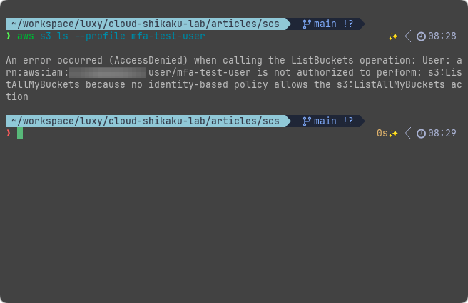 An error occurred (AccessDenied) when calling the ListBuckets operation: User: arn:aws:iam::<ACCOUNT_ID>:user/mfa-test-user is not authorized to perform: s3:ListAllMyBuckets because no identity-based policy allows the s3:ListAllMyBuckets action
