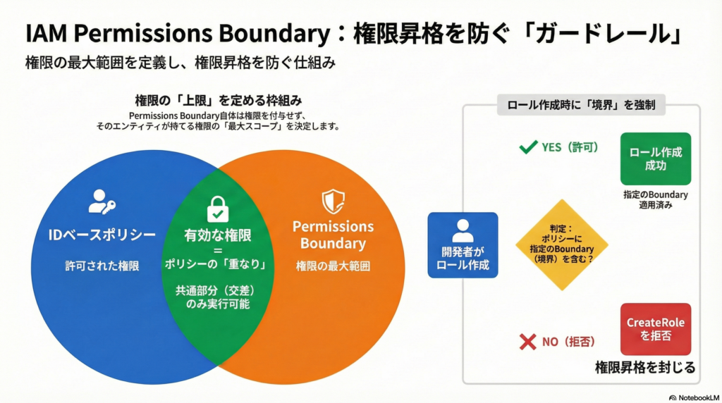 - 「有効な権限 = IDベースポリシー ∩ Permissions Boundary」という評価ロジックを把握できる