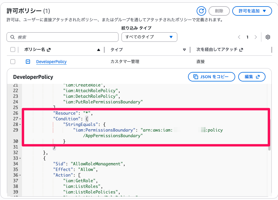 開発者ユーザーに付与するポリシーを作成します。このポリシーにはアプリケーションに必要な権限に加えて、Permissions Boundaryの付与を条件としたIAMロール作成権限を含めます。