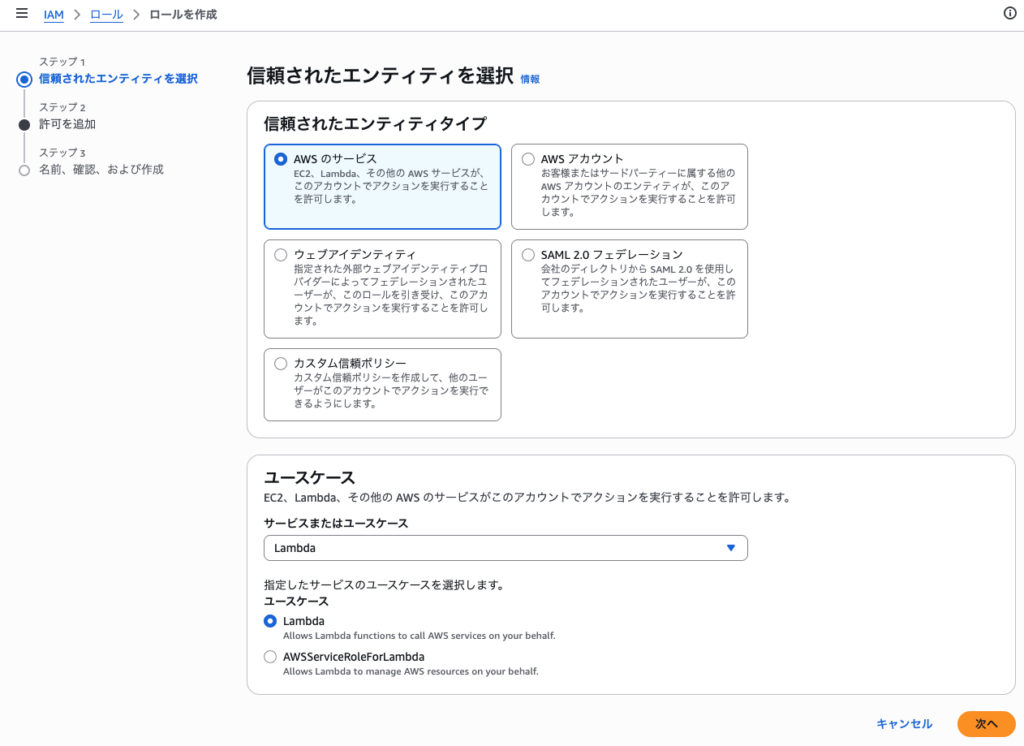 - 信頼されたエンティティタイプで「AWSのサービス」を選択し、ユースケースで「Lambda」を選択します