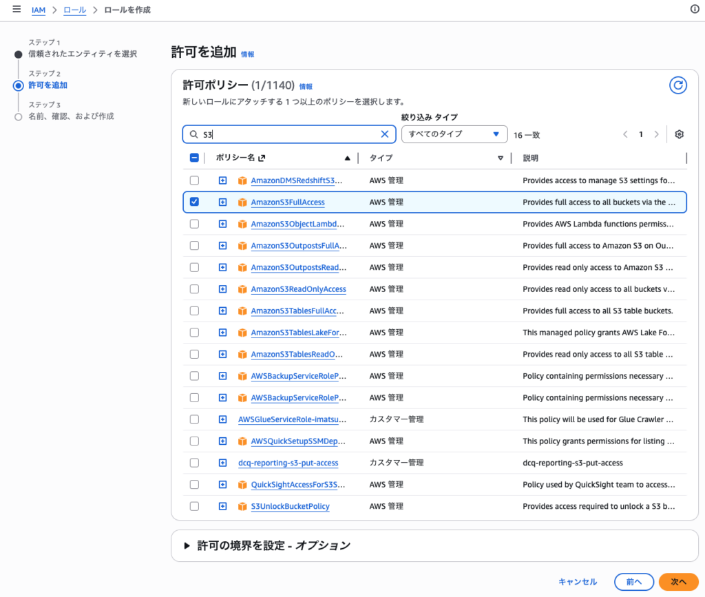 AmazonS3FullAccessと入力し、チェックを入れます - 「Permissions Boundary」セクションの「Permissions Boundaryを使用してアクセス許可の上限を設定する」を展開します