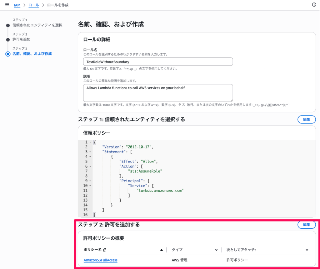 ステップ5: Permissions Boundaryを付けてロールを作成する(成功の確認)