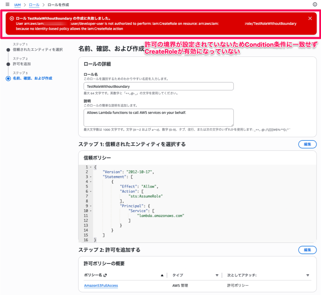 結果: 権限が不足している旨のエラーメッセージが表示され、ロールの作成に失敗します。DeveloperPolicyのAllowCreateRoleWithBoundaryステートメントの条件(iam:PermissionsBoundary)が満たされないため、iam:CreateRoleの実行が許可されません。