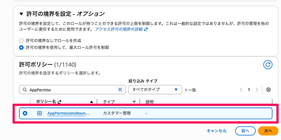 AppPermissionsBoundaryと入力し、表示されたポリシーを選択します