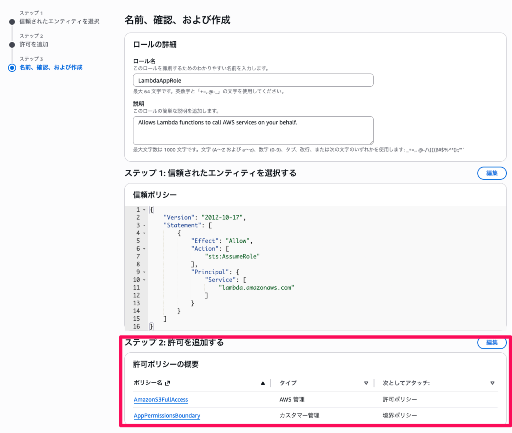 | IAMロール | LambdaAppRole(実践中に作成) | Lambda用ロール(Boundary付き) |