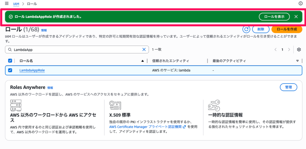 LambdaAppRoleと入力します - 「ロールを作成」をクリックします