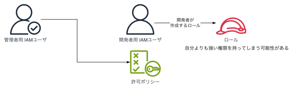 例えば、S3とEC2の操作権限のみを持つ開発者が、AdministratorAccessポリシーを付与したIAMロールを作成し、そのロールをLambda関数に割り当てれば、Lambda経由であらゆるAWSリソースを操作できてしまいます。